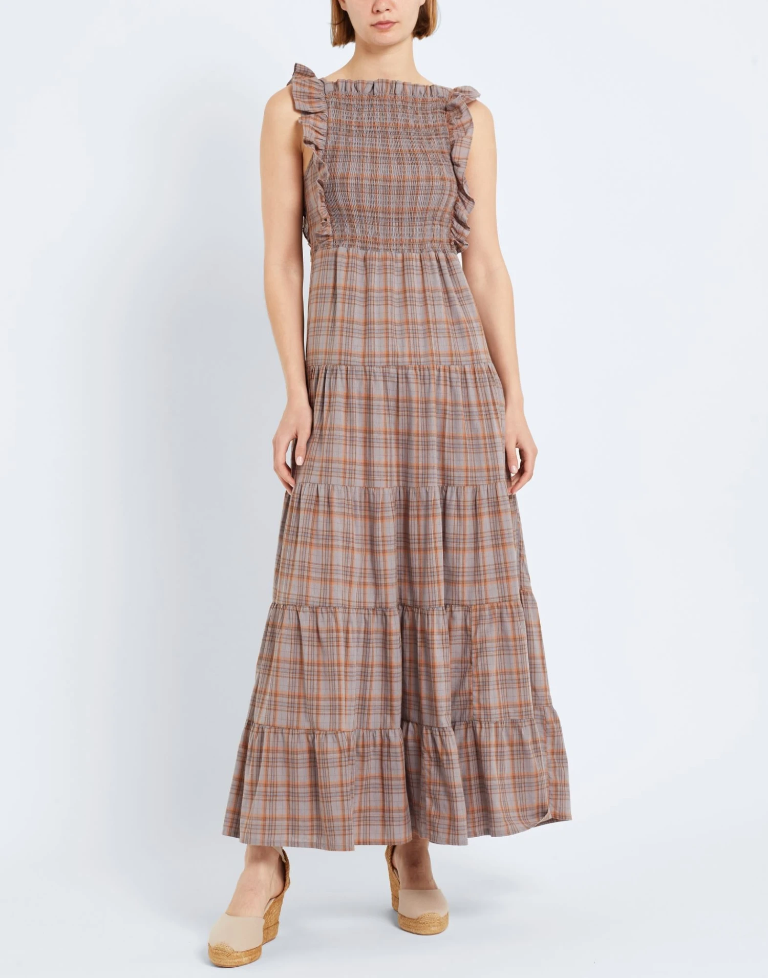 Taglio smanicato e fantasia scozzese sono gli elementi che caratterizzano questo abito lungo realizzato in leggero cotone. Foderato all’interno, presenta un gioco di ruches e arricciature che lo impreziosiscono sul corpetto.La modella indossa una taglia S/40
