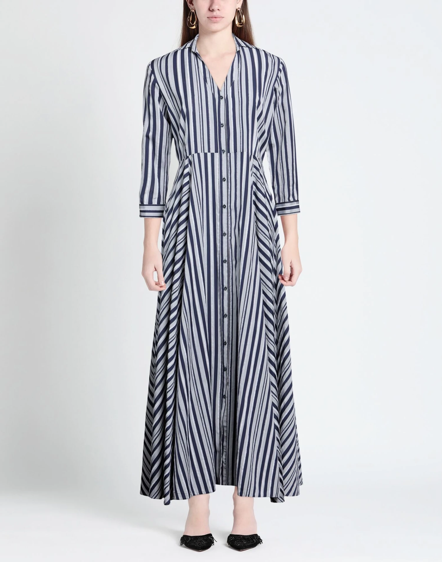 tela, senza applicazioni, a righe, collo a v, maniche lunghe, interno sfoderato, bottoni, senza tasche, modello chemisier