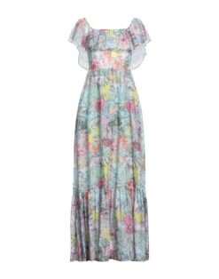 tela, ruches, fantasia floreale, collo con scollatura quadrata, maniche corte, maniche ad aletta, interno foderato, zip, gancetti, senza tasche, fondo a balze, modello stile impero