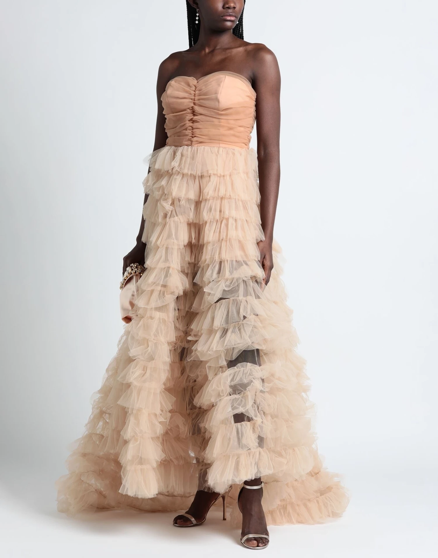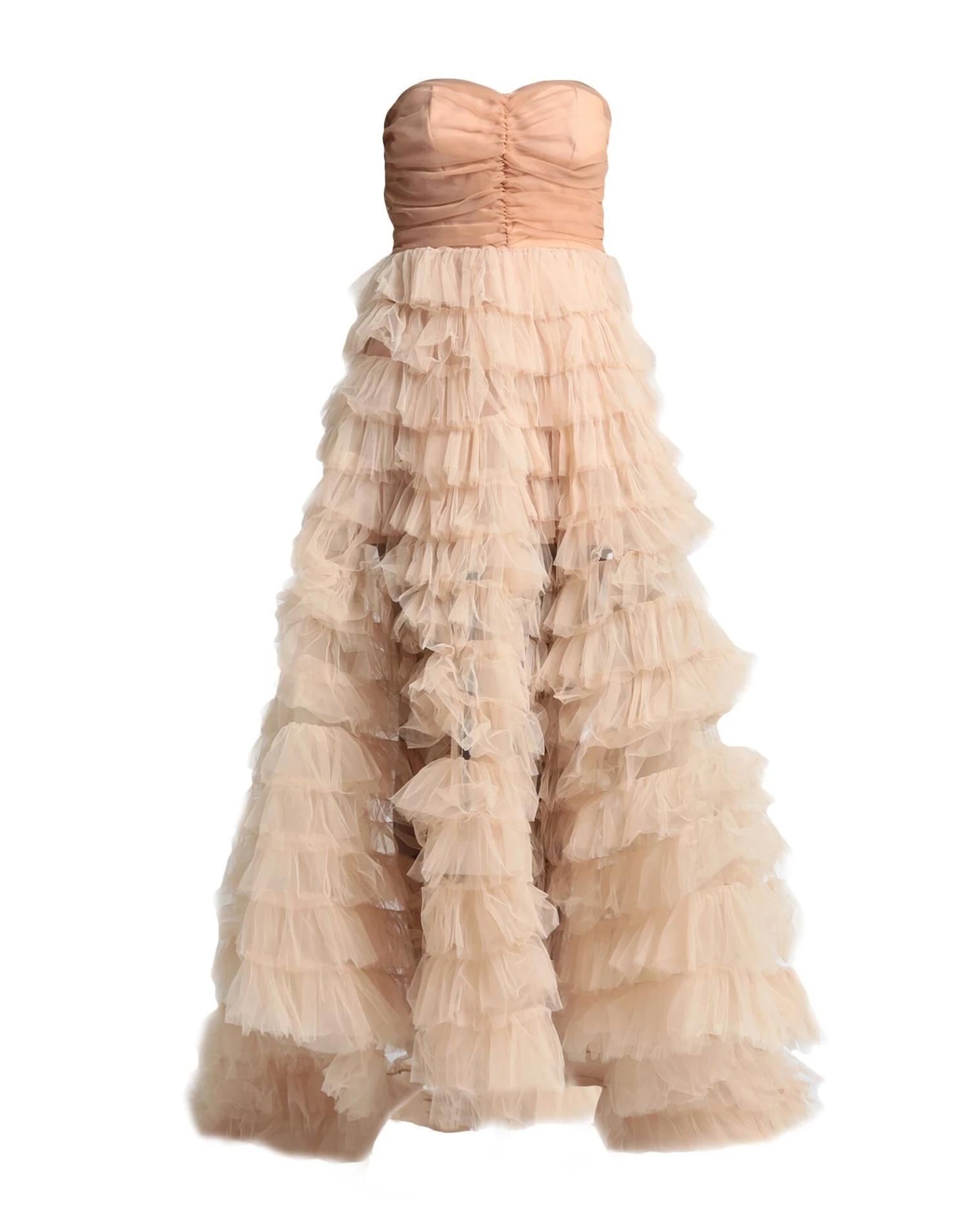 tulle, drappeggi, balze, tinta unita, collo con scollatura profonda, senza maniche, interno parzialmente foderato, gancetti, zip, taschino doppio, fondo asimmetrico, modello a trapezio