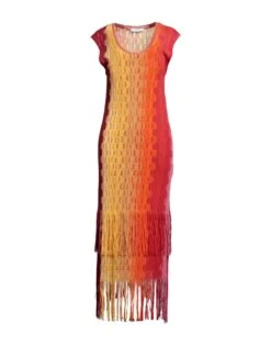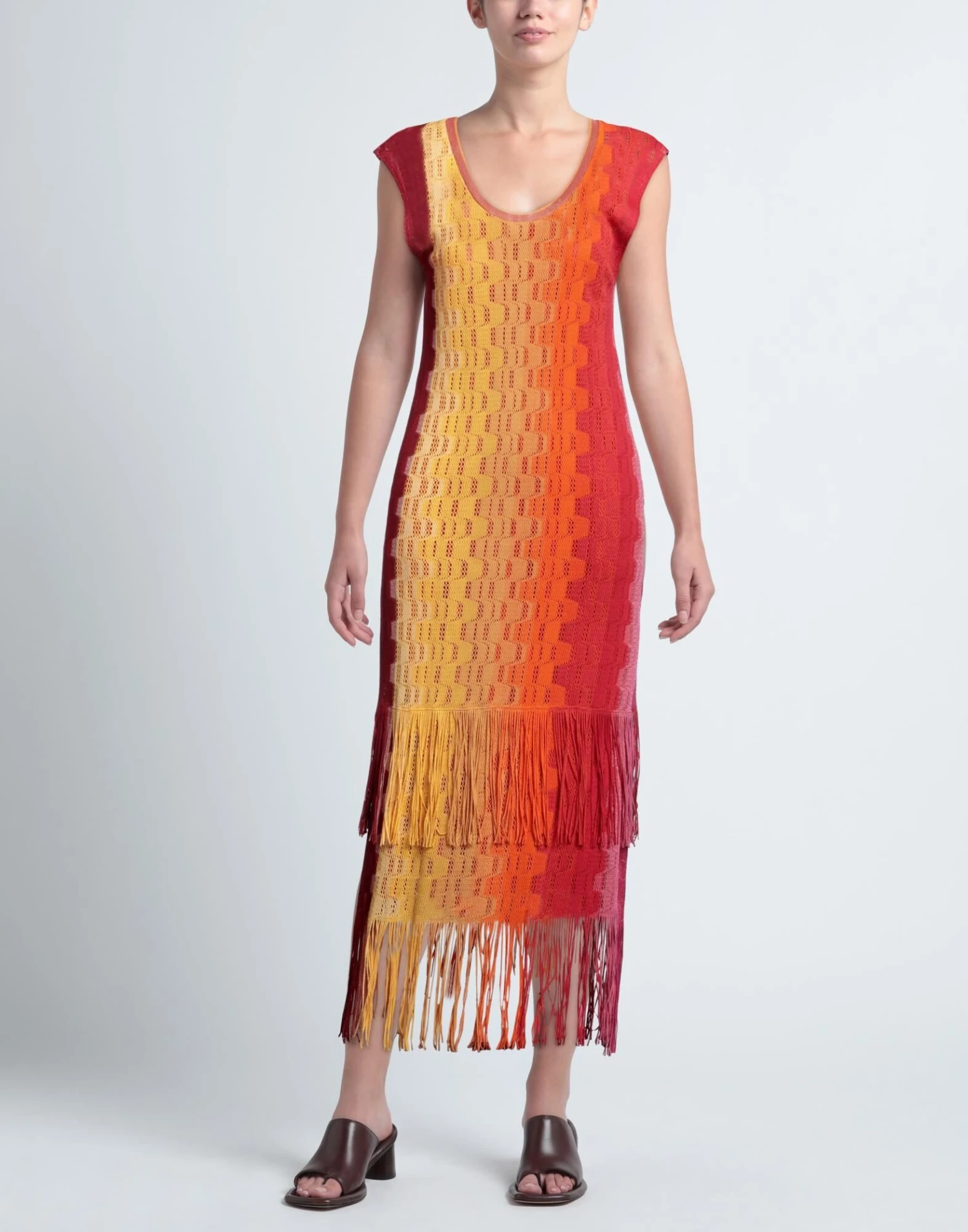lavorato a maglia, maglia leggera, frange, fantasia multicolore, collo tondo, maniche corte, sottoveste interna, senza tasche, vestito