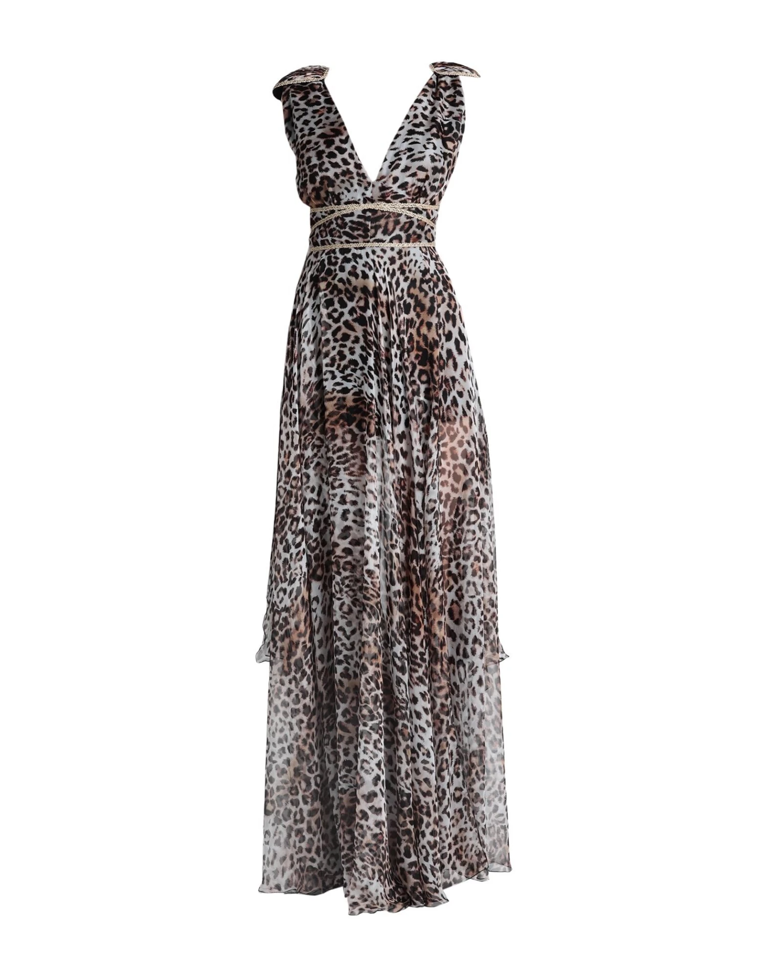 crêpe, lamè, applicazioni a contrasto, fantasia leopardata, collo con scollatura profonda, senza maniche, pantaloncino interno, zip, senza tasche, spacco laterale, modello a trapezio