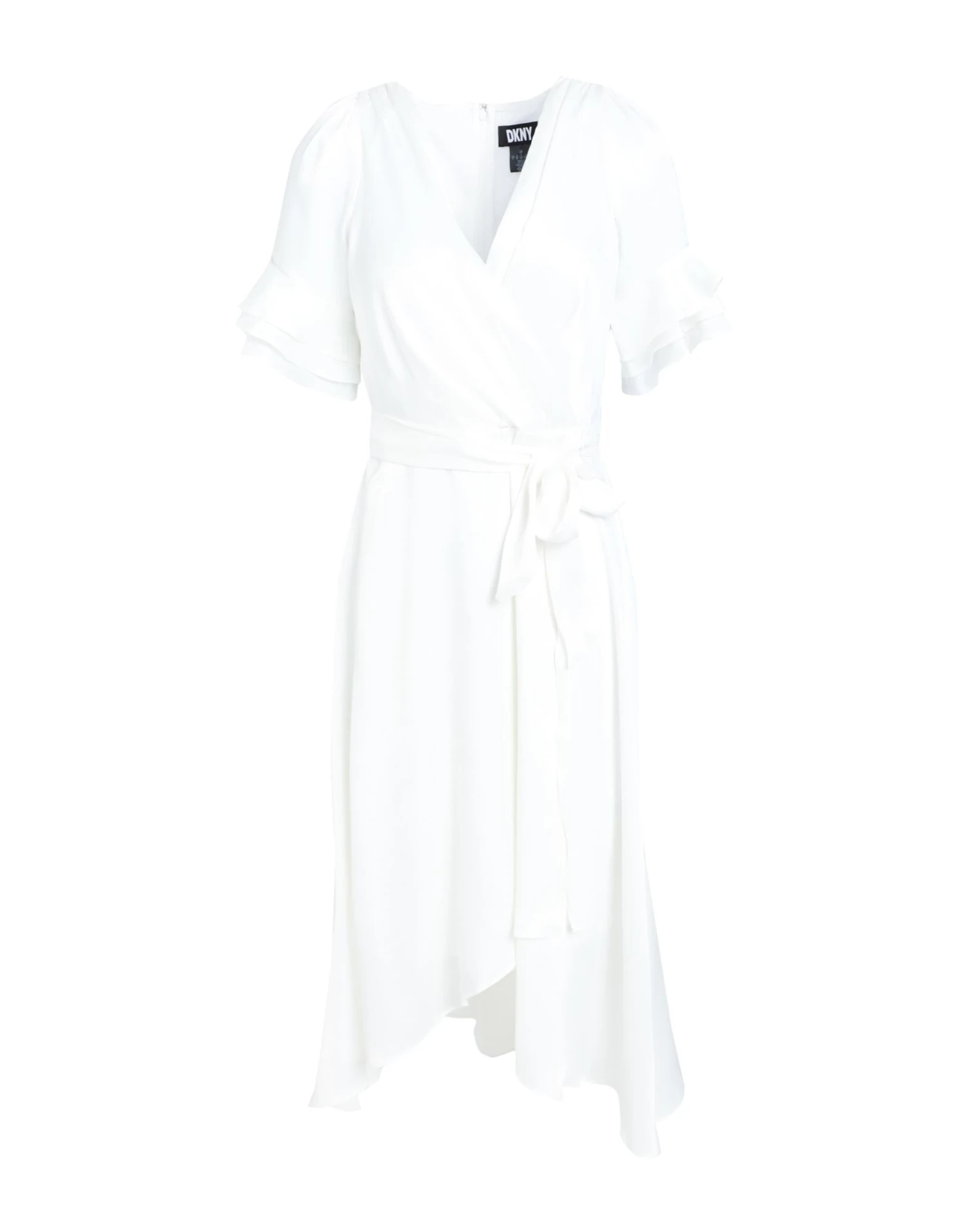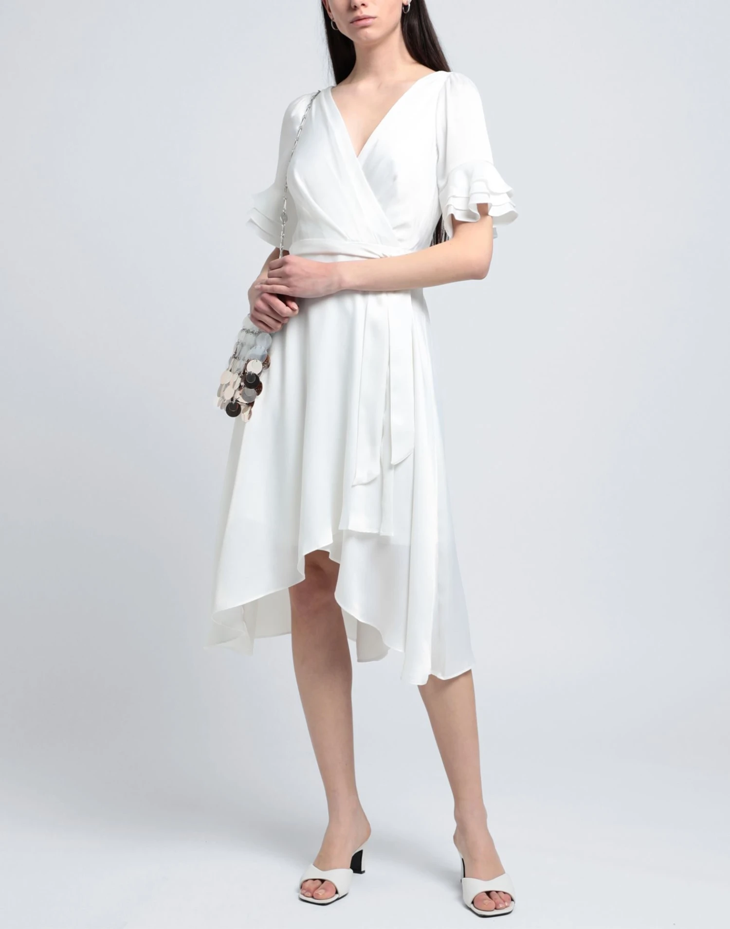 raso, cintura, balze, tinta unita, collo a v, maniche corte, interno foderato, zip, gancetti, vestito