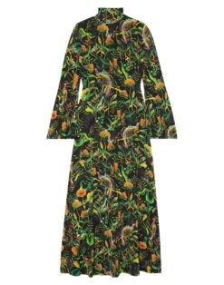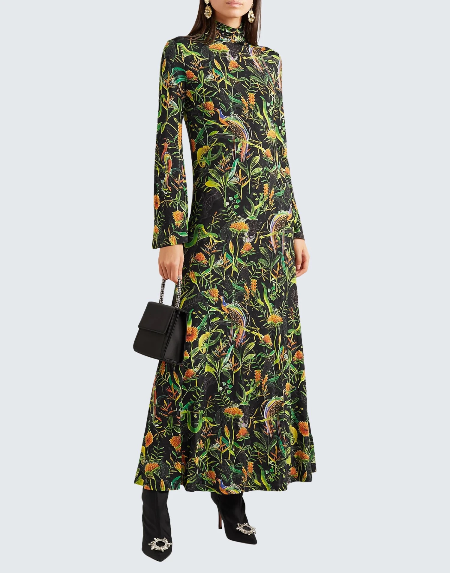 jersey, senza applicazioni, fantasia floreale, collo alto, maniche lunghe, interno sfoderato, 1 bottone, zip, senza tasche, modello a trapezio