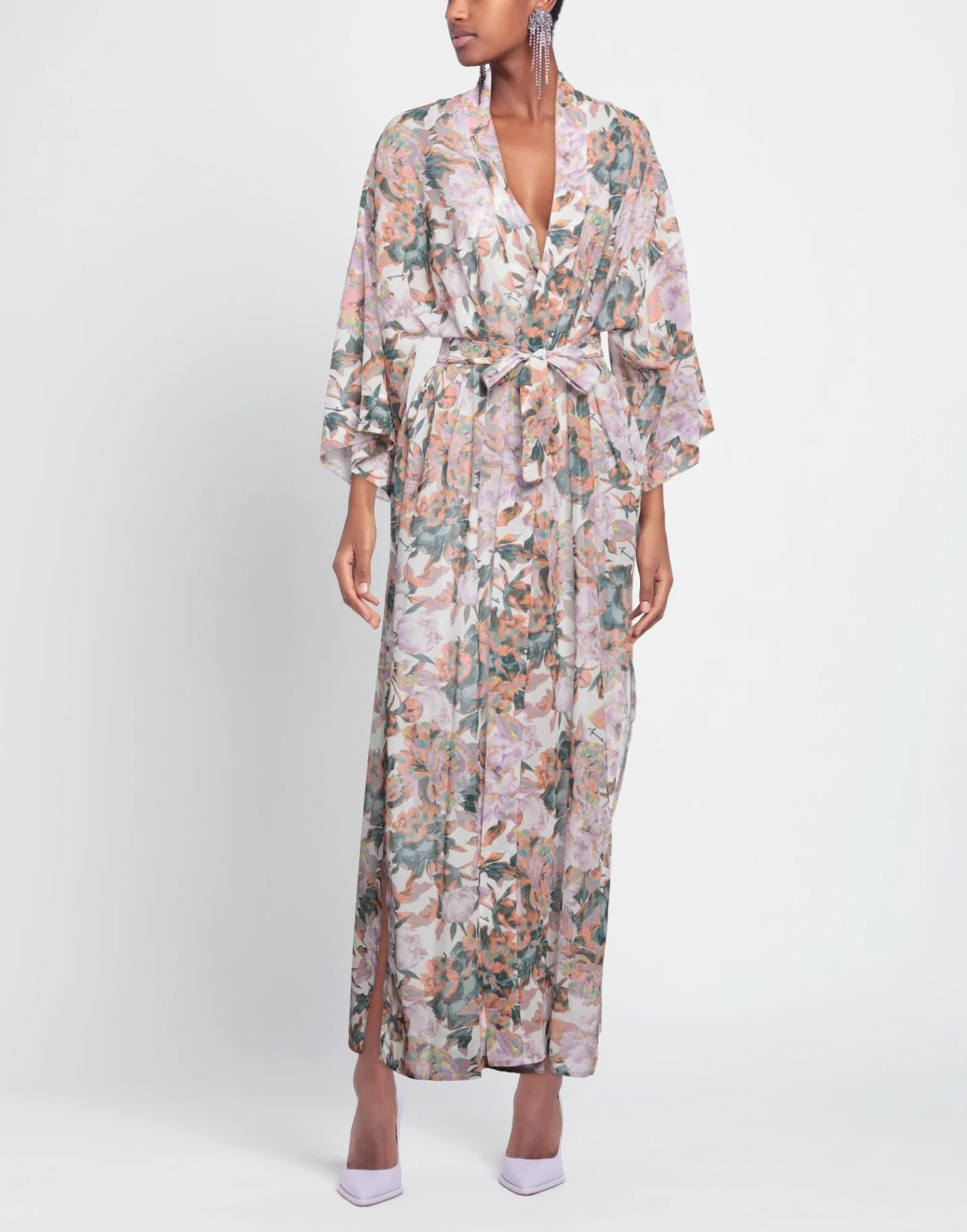 crêpe, brand logo, cintura, fantasia floreale, collo a v, maniche lunghe, interno sfoderato, senza tasche, fondo con spacchetti laterali, modello a trapezio