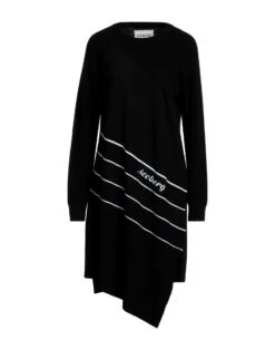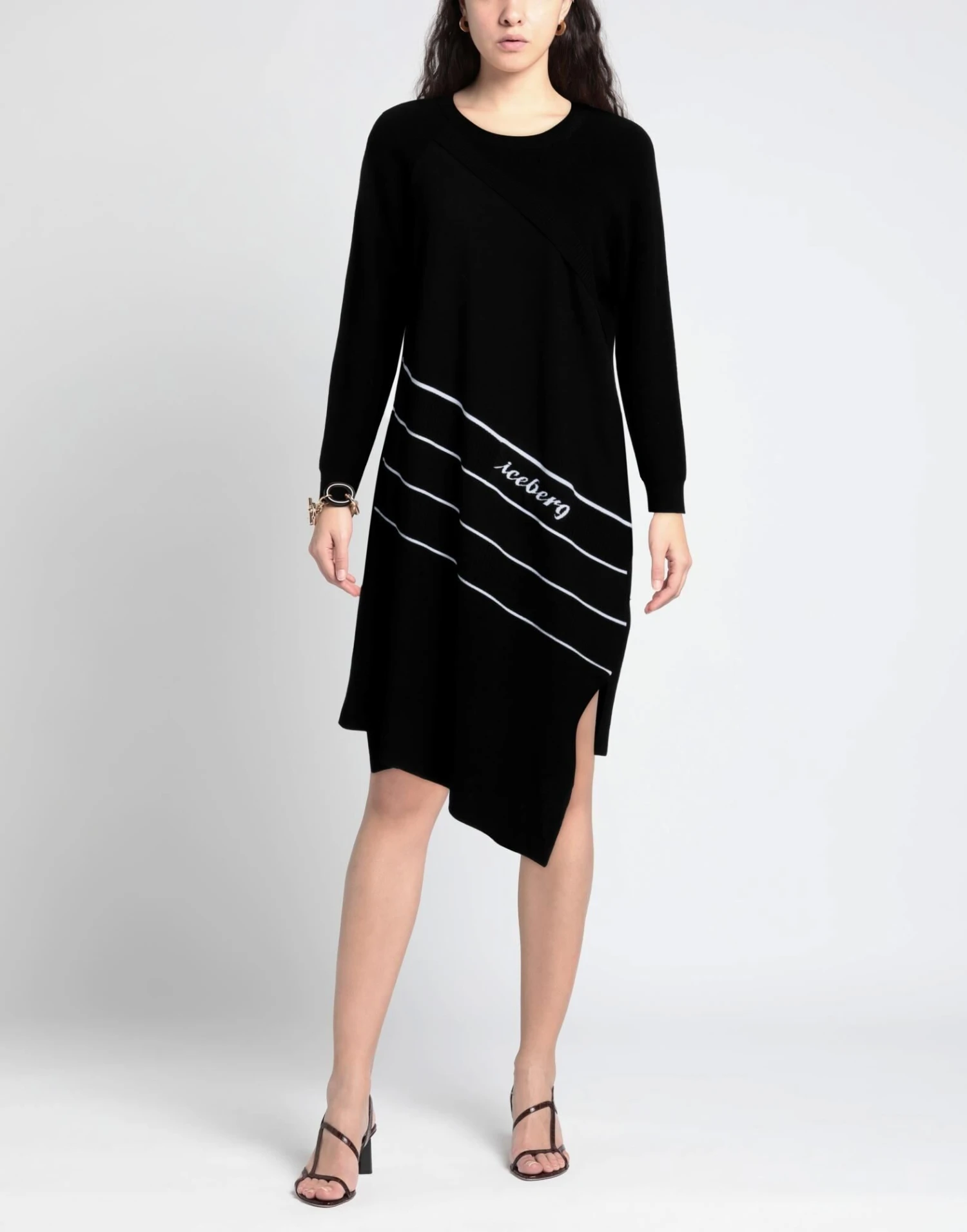 lavorato a maglia, brand logo, fantasia bicolore, collo tondo, maniche lunghe, fondo asimmetrico, vestito