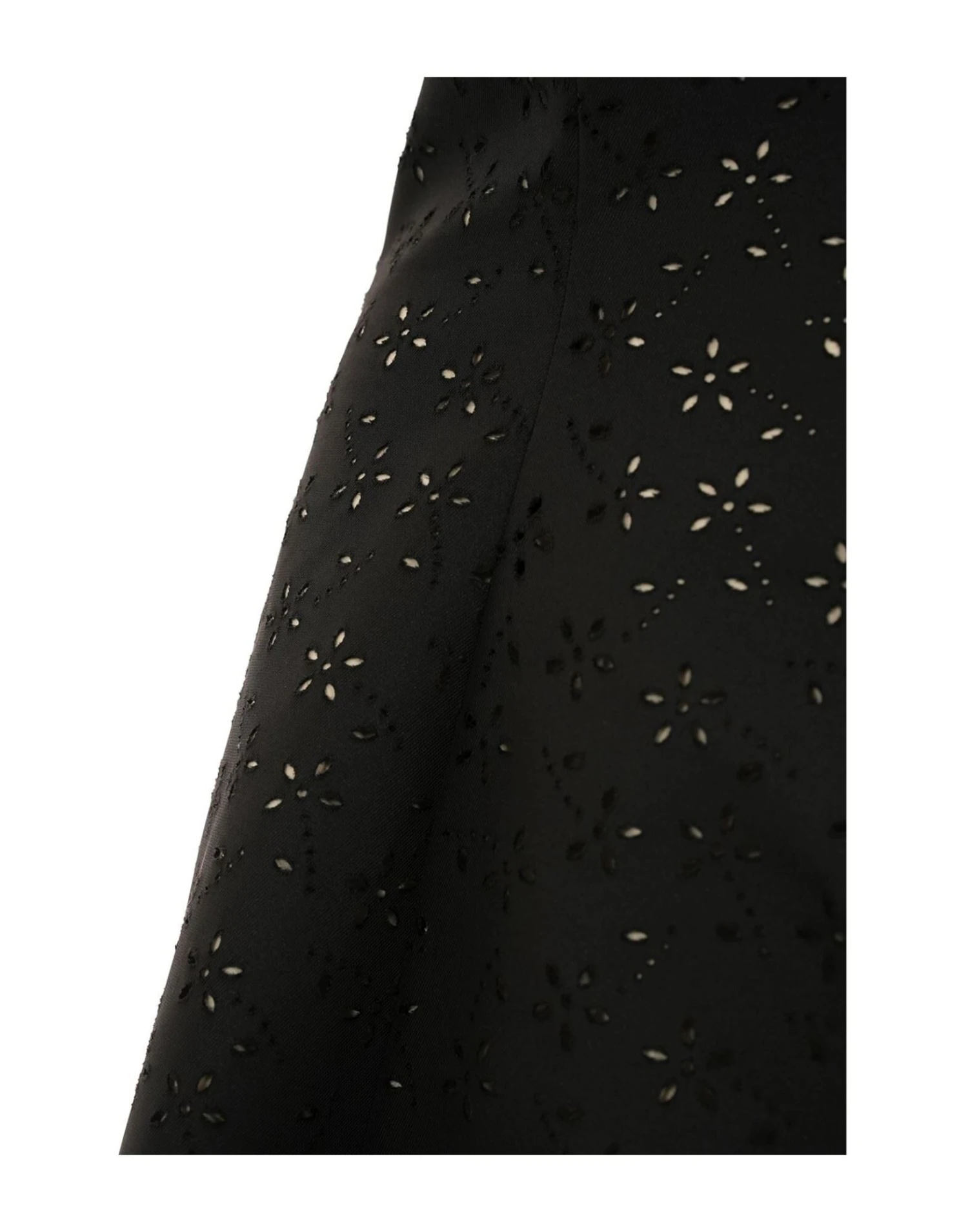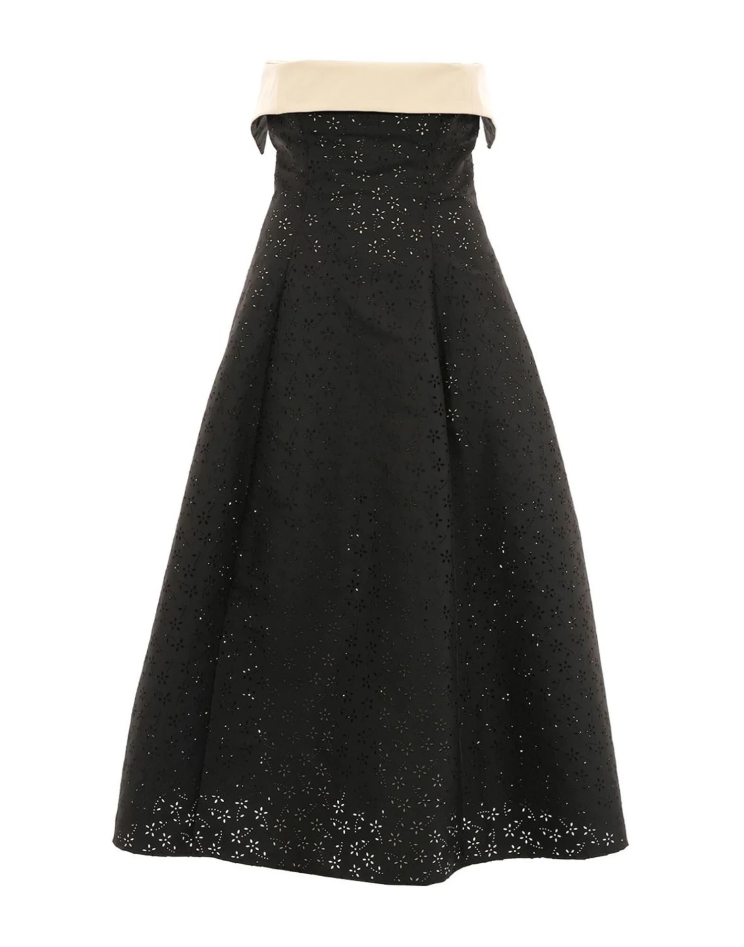 Nero/bianco, misto cotone, ricami floreali all-over, design svasato, scollo quadrato, chiusura posteriore con zip nascosta, stile a fascia e lunghezza al polpaccio.