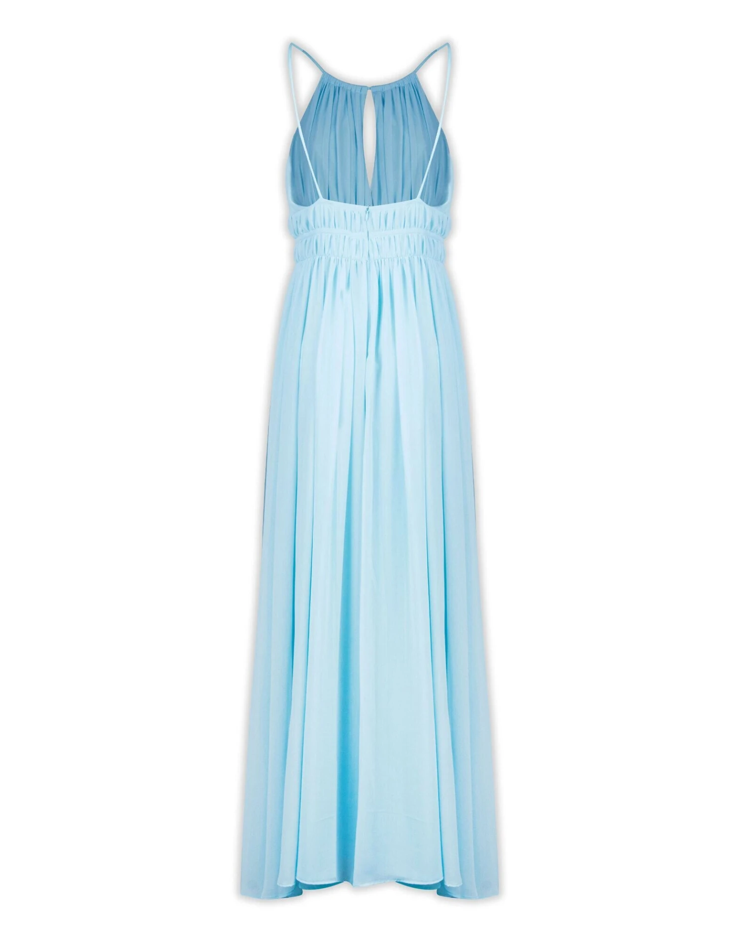 Abito lungo in georgette, linea fit & flare con arricciature. Scollo con goccia, spallini sottili. Chiusura con zip invisibile sul retro. Foderato in crêpe. L’abito lungo è il protagonista delle occasioni speciali ed eleganti, perfetto per le cerimonie. Tessuto contenente poliestere rigenerato o poliammide rigenerato, fibre provenienti dal riciclo di materiale plastico. Nome modello: Agami