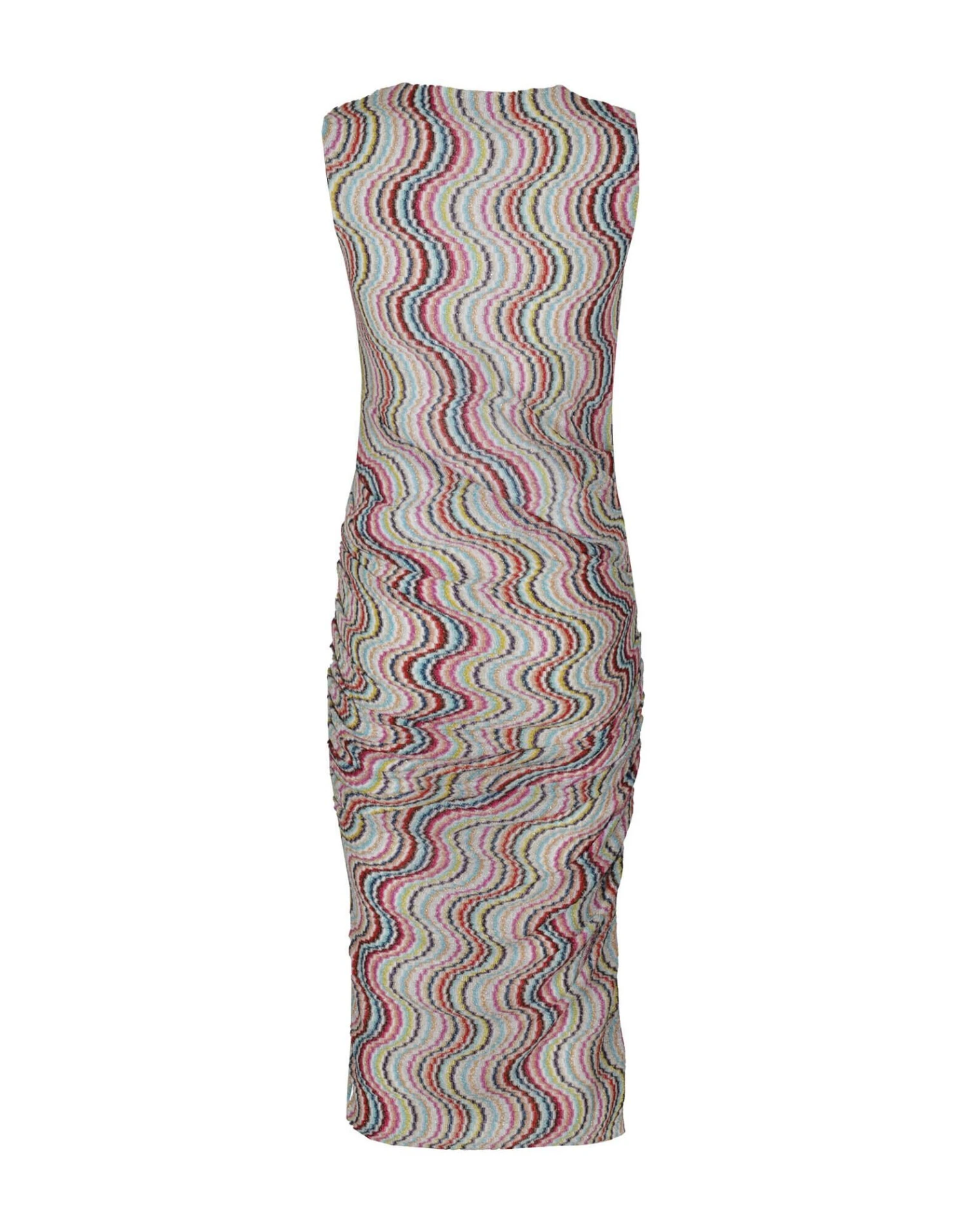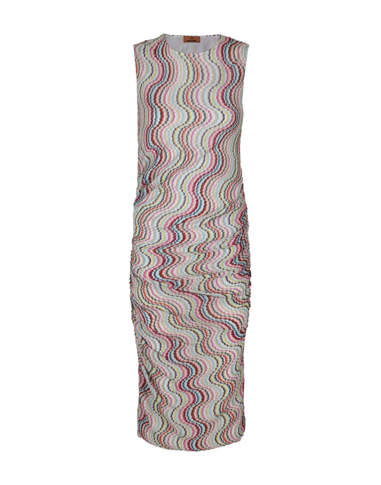 Abito lungo, multicolore e laminato di Missoni, smanicato, girocollo, vestibilità aderente, drappeggiato sul fianco.