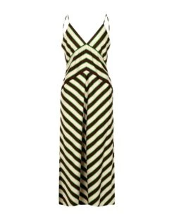 Abito MSGM midi in twill di viscosa con stampa “Jumbo Stripe”. Scollo a V con spalline fini. Chiusura con zip posterirore. Lunghezza sotto il ginocchio con fondo dritto. Fit regolare.