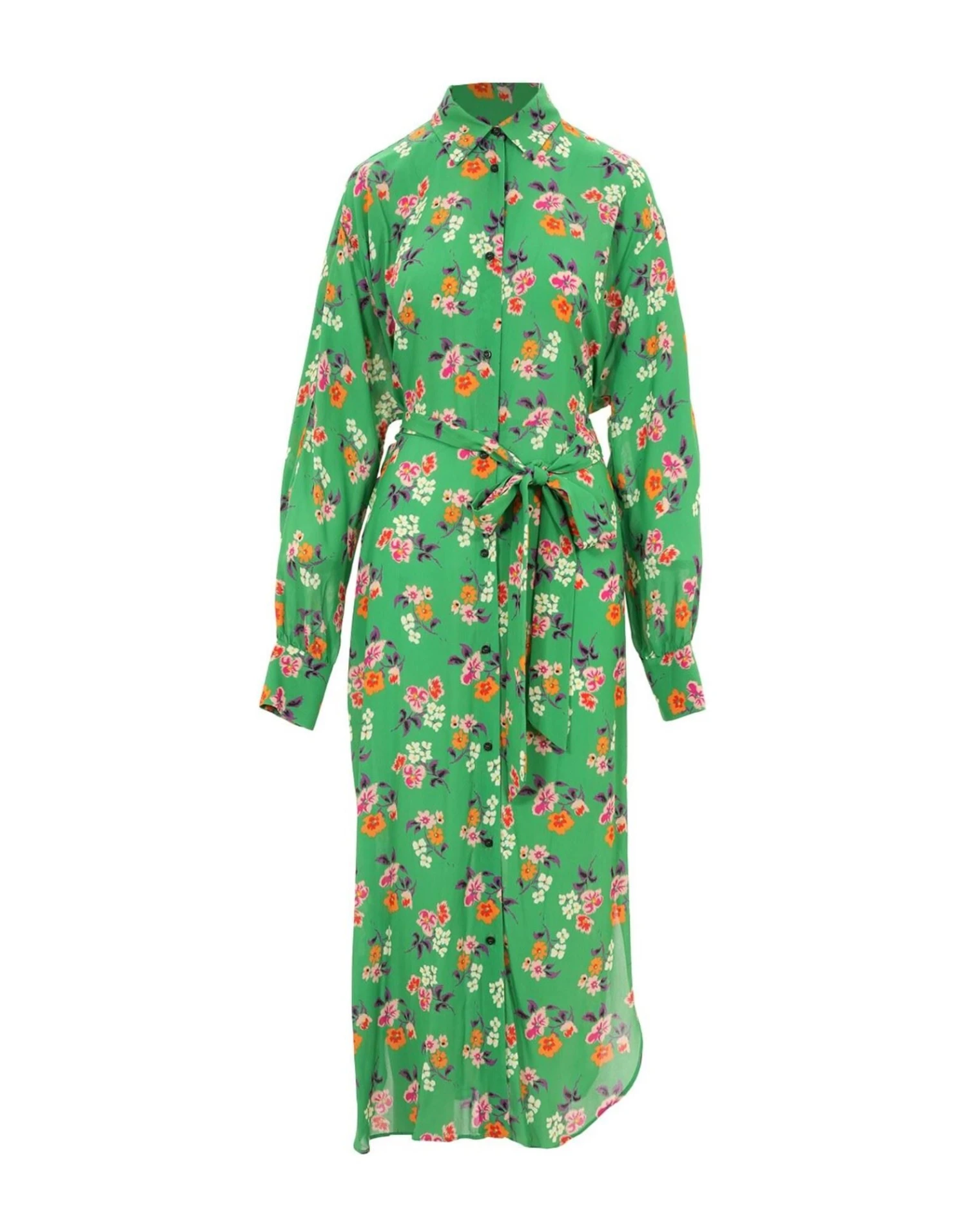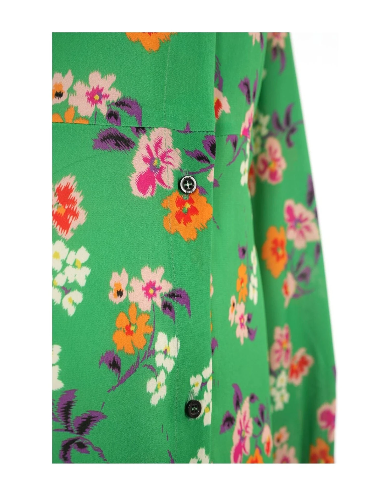 Verde smeraldo, stampa a fiori, dettaglio con nodo, colletto classico, chiusura frontale con bottoni, maniche lunghe e lunghezza media.