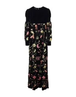 ciniglia, velluto, ricamo, fantasia floreale, collo tondo, maniche lunghe, senza tasche, interno semi-foderato, chiusura sul retro, zip, elasticizzato, modello a trapezio