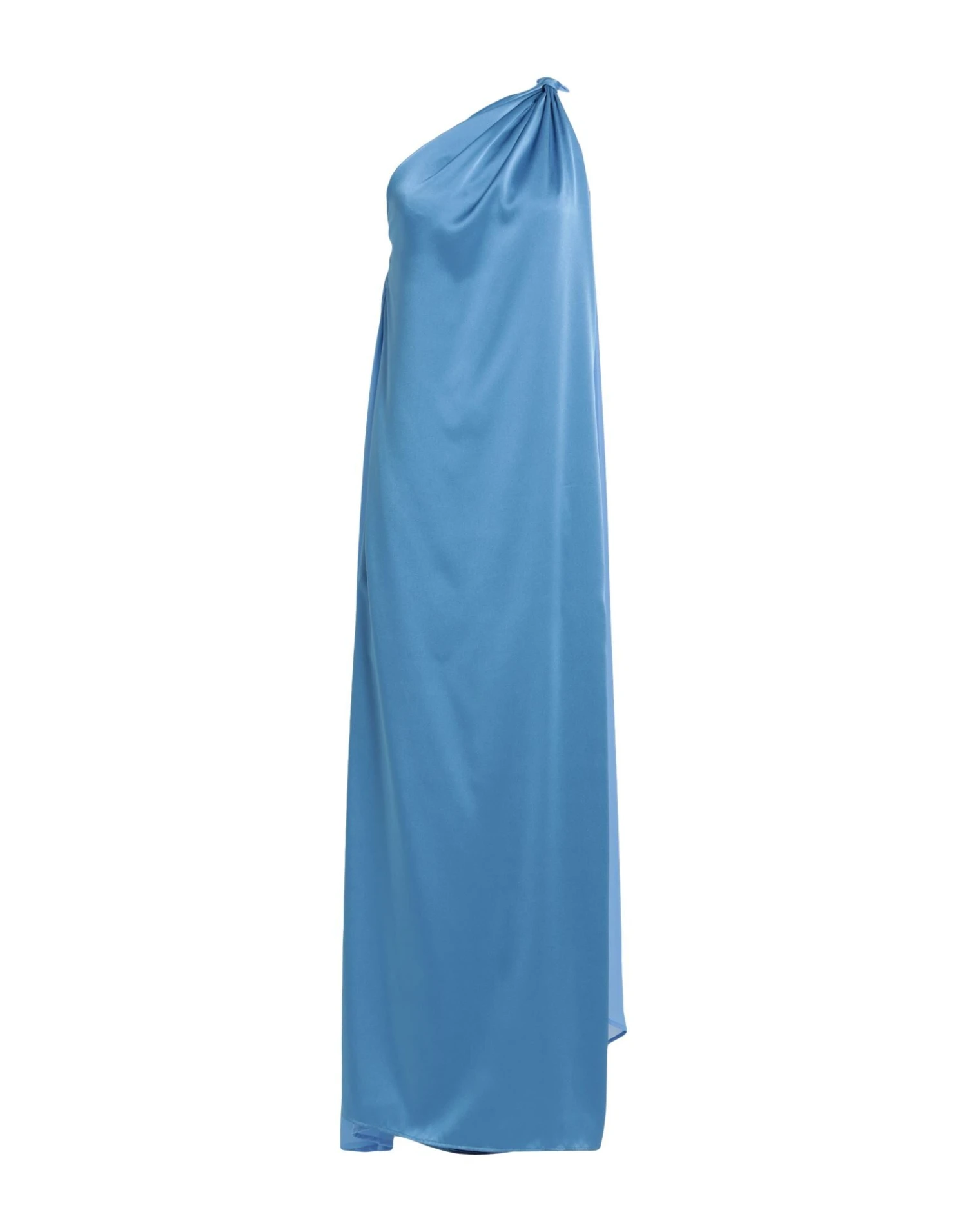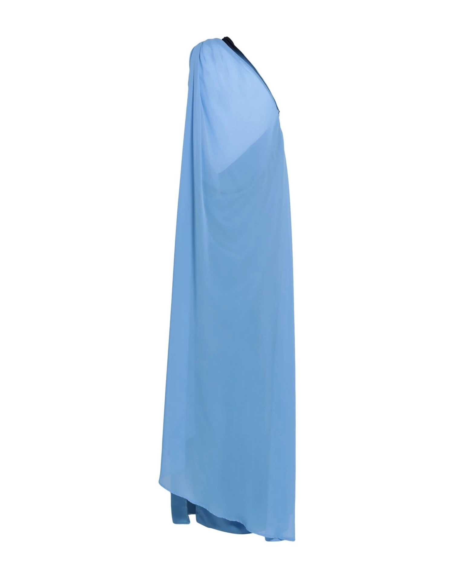 raso, crêpe, drappeggi, fantasia bicolore, collo con scollatura profonda, monospalla, interno sfoderato, senza tasche, modello a trapezio