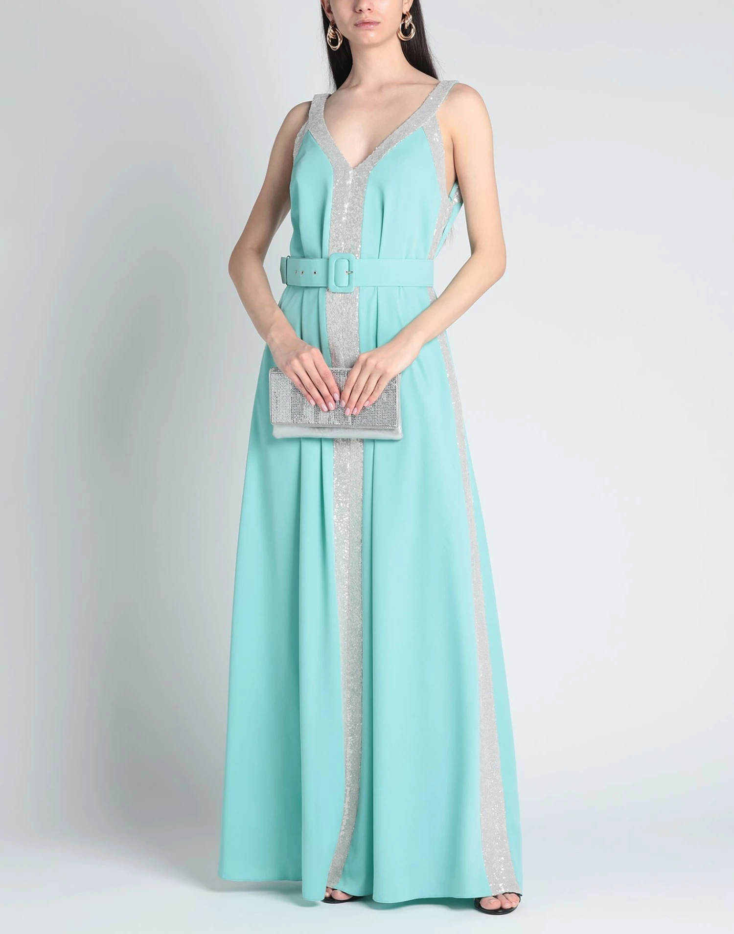 crêpe, paillettes, cintura, tinta unita, collo con scollatura profonda, senza maniche, interno foderato, senza tasche, modello a trapezio