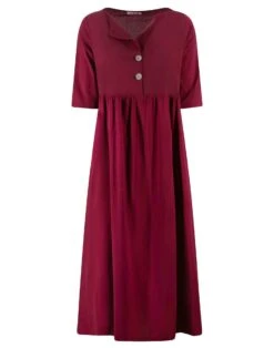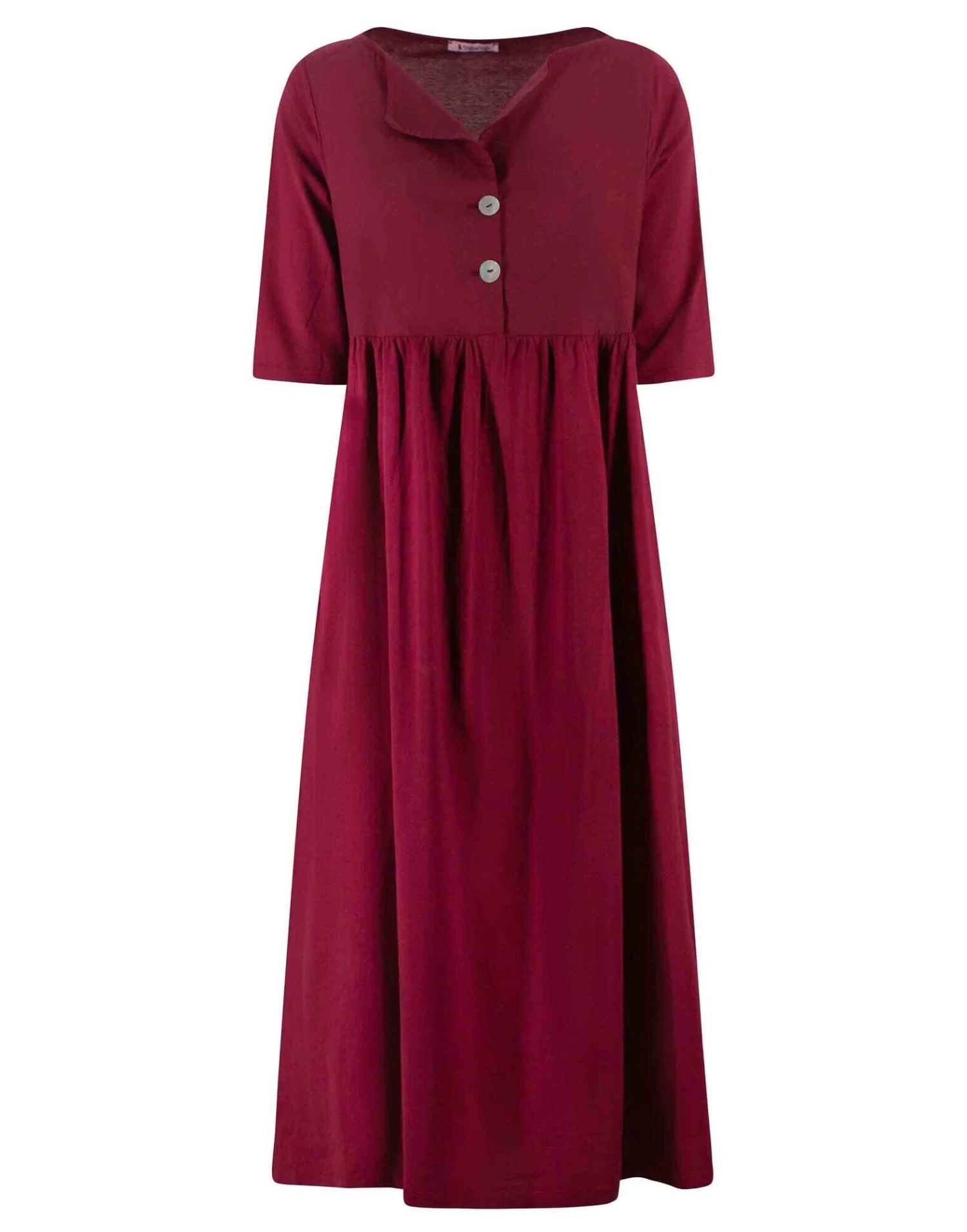 Abito lungo da donna Acqua firmato TreBarraBi realizzato in puro cotone leggero di colore rosso scuro. Scollo a barca con 3 grandi bottoni, piega sotto al seno e ampio sui fianchi con spaccheti laterali. Maniche corte. Composizione e dettagli: Composizione: 100% cotone. Avvertenze: Lavaggio a mano. Si consiglia lavaggio in aziende specializzate nel settore. Lunghezza totale: 120 cm nella taglia S