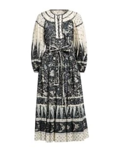 tela, arricciature, cintura, fantasia floreale, collo tondo, maniche lunghe, manica a sbuffo, polsini con elastico, interno sfoderato, bottoni, multitasche, fondo a balze, modello a ruota